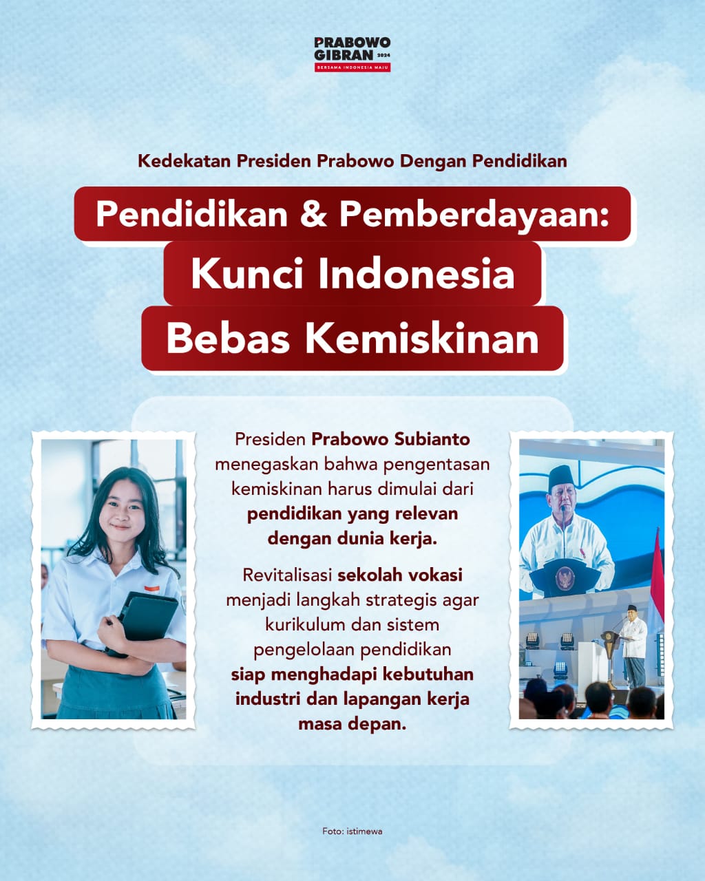 Presiden RI Prabowo menekankan bahwa pendidikan yang relevan dengan dunia kerja adalah langkah awal untuk memutus siklus kemiskinan.