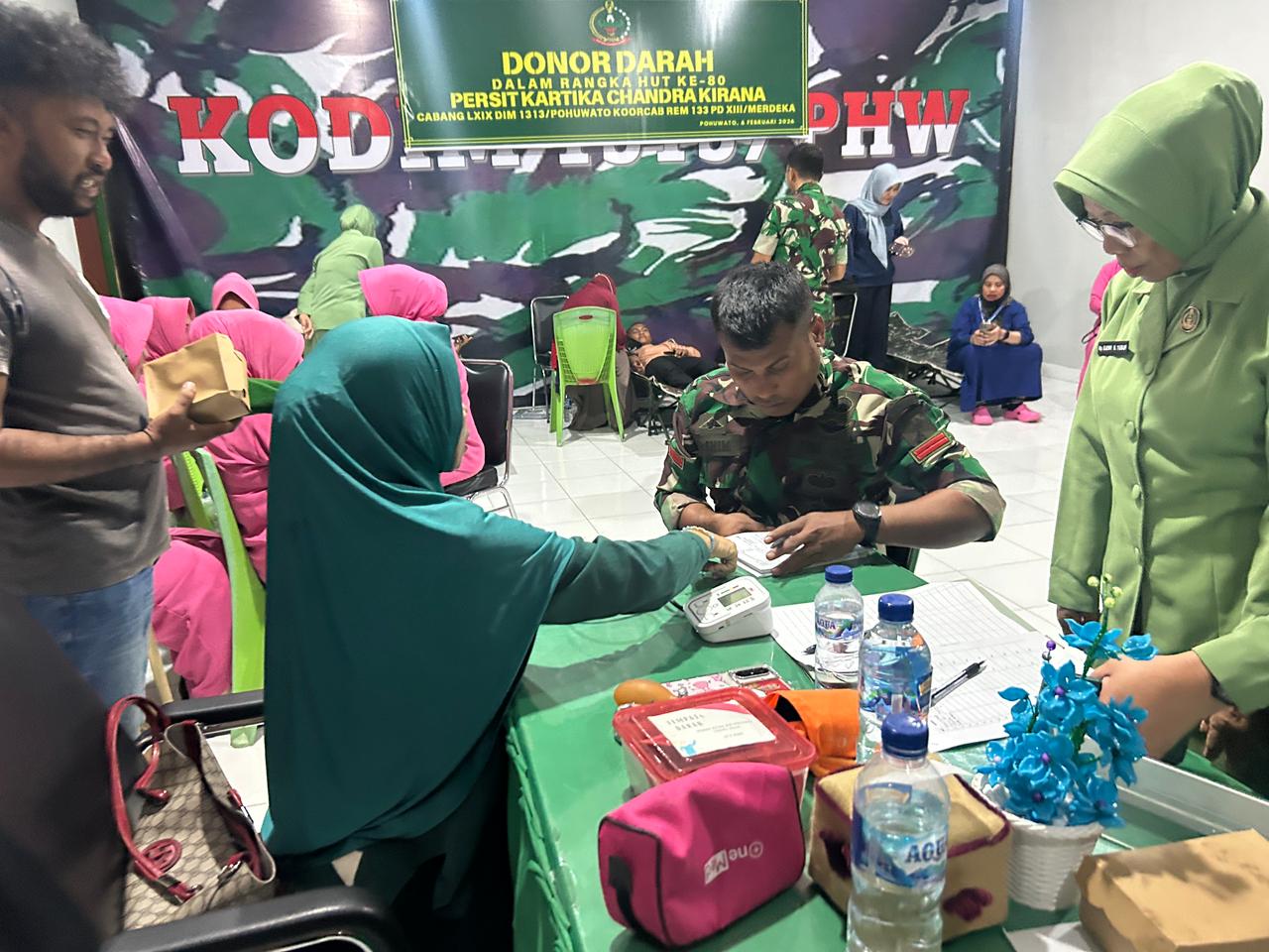 KABARINDO.NEWS, Pohuwato – Dalam rangka memperingati Hari Ulang Tahun (HUT) Persit Kartika Chandra Kirana ke-80 Tahun 2026, Kodim 1313/Pohuwato menggelar kegiatan donor darah di Makodim 1313/Phw, Desa Pohuwato Timur, Kecamatan Marisa, Kabupaten Pohuwato, Jumat (6/2/2026).